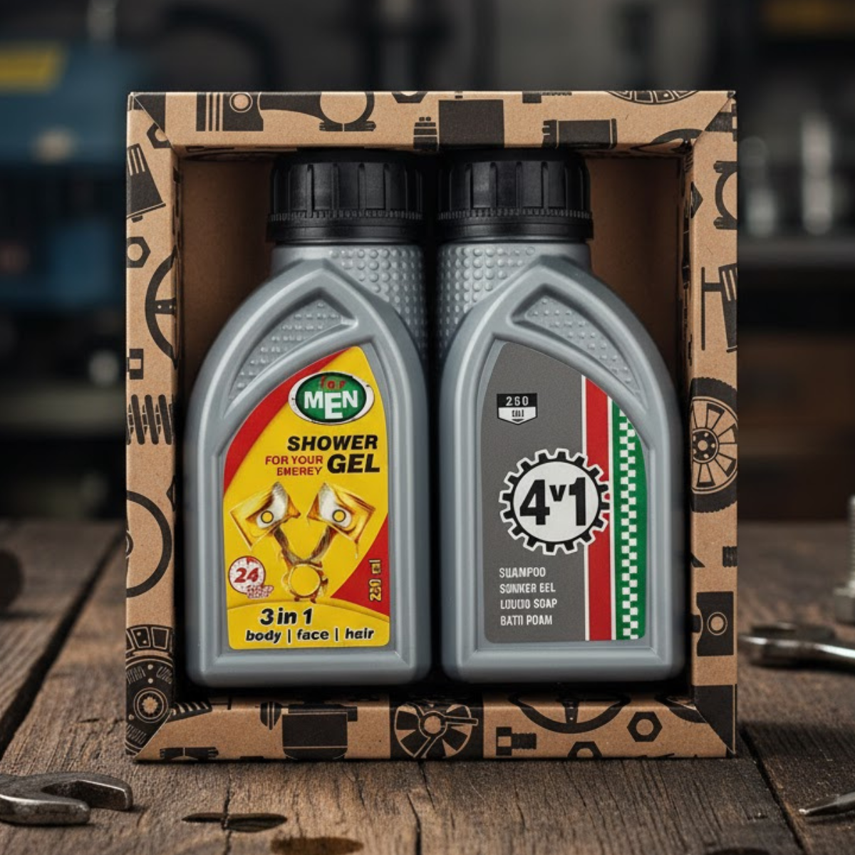 Dušigeeli ja šampooni pakendid näevad välja nagu autode määrdeainepudelid, seega sobib see komplekt ideaalselt meestele, kellele ei meeldi mitte ainult oma keha eest hoolitseda, vaid kes hindavad ka vaimukaid ja praktilisi kingitusi.