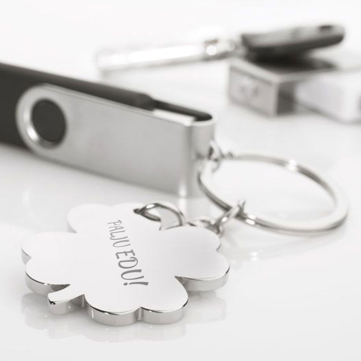 Metallist võtmehoidja, millele on graveeritud "Palju edu!".